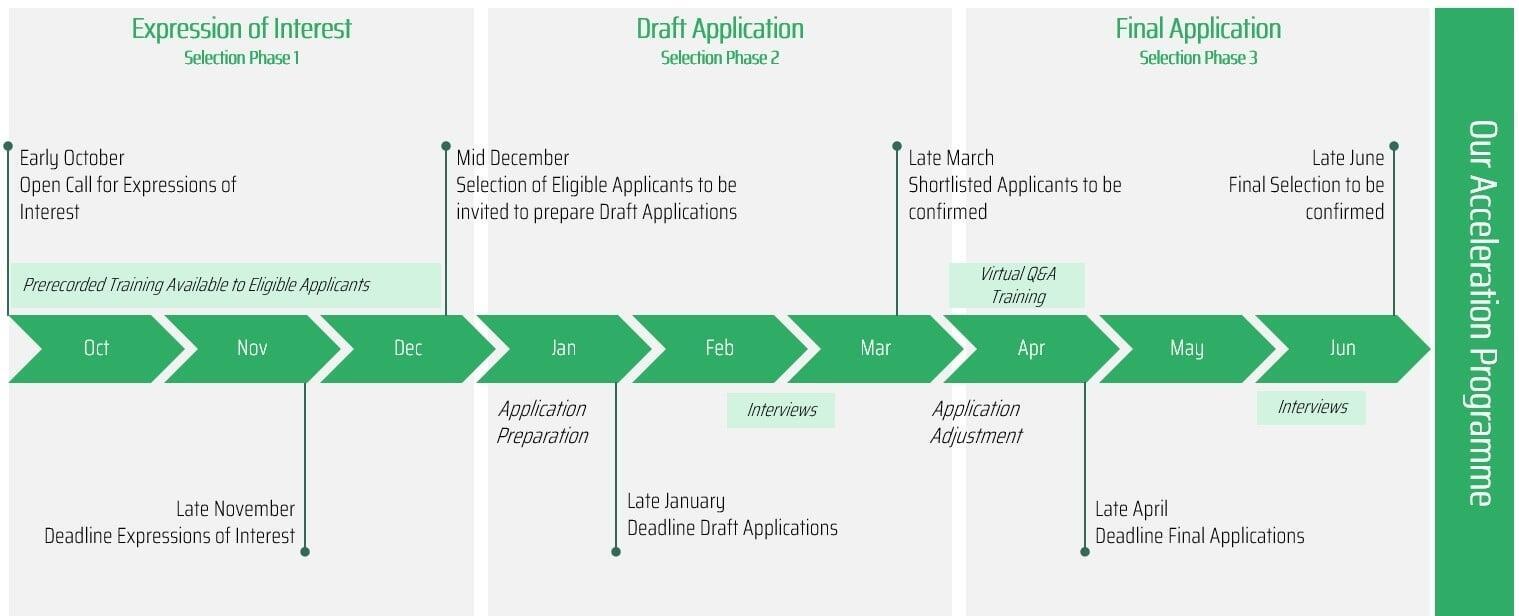 - Up to 4 Applicants will be selected to join our acceleration programme and benefit from four years of technical and financial support.